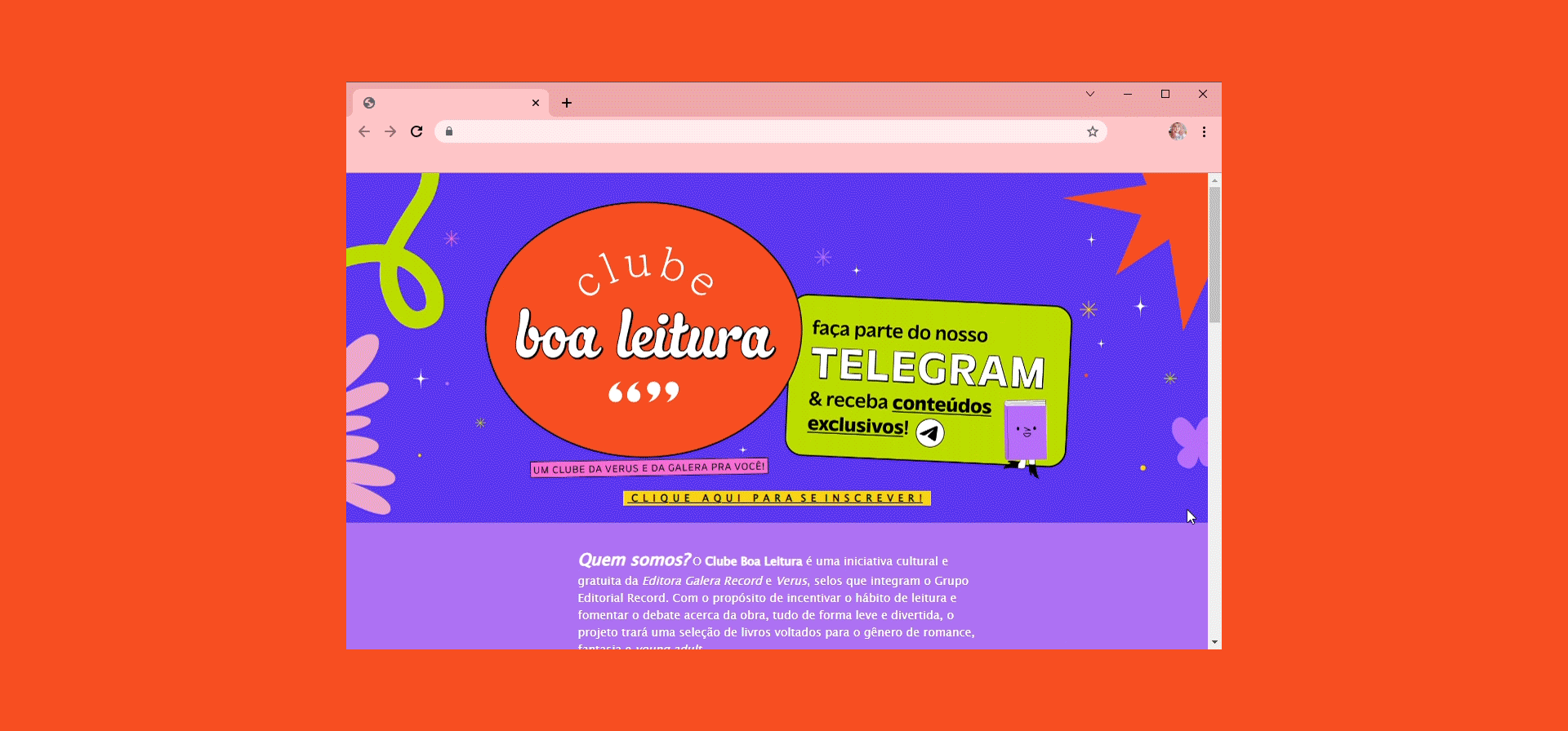 Identidade visual criada para o clube de leitura YA das editoras Galera Record e Verus Editora.